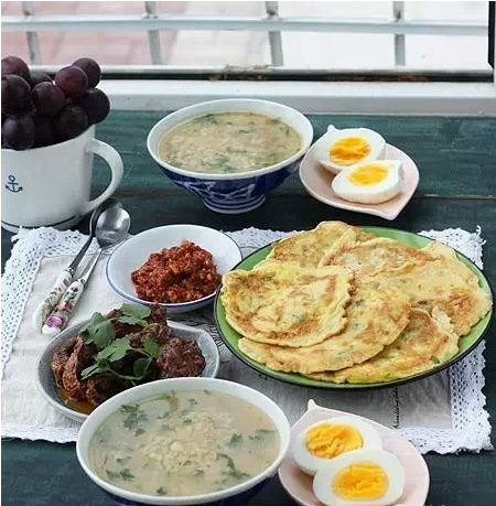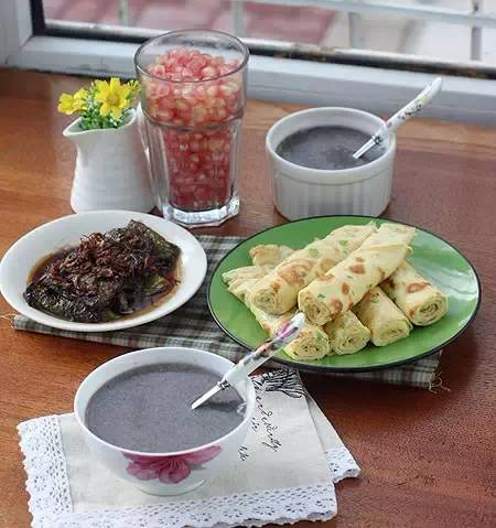 15、蔬菜粥;熏鱼;煮蛋抹自制辣酱;用南瓜丝和葱花面粉鸡蛋做了几张柔软的煎饼;还有紫葡萄。