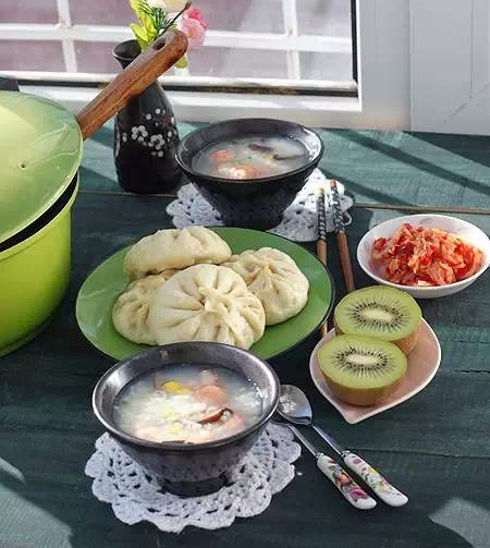 11、白菜粉条馅包子,鲜虾滑玉米粥,辣白菜,还有水果猕猴桃!