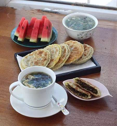 9、榄菜豆角馅饼,菠菜鸡蛋汤,西瓜