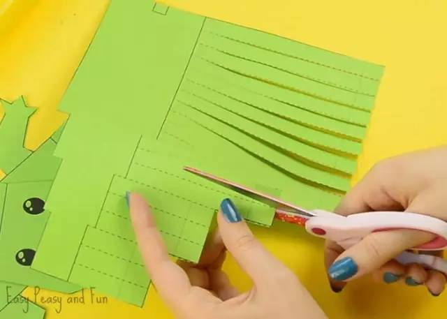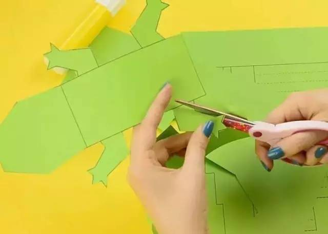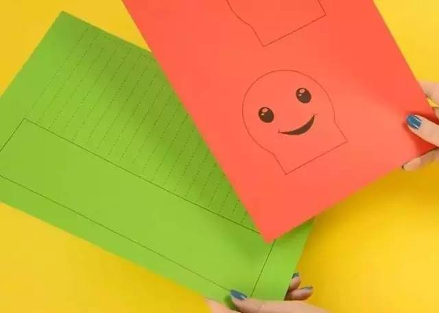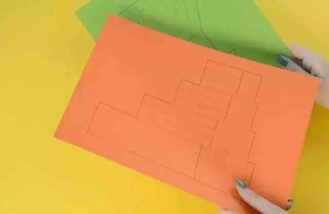 2、沿虚线将绿色卡纸的下半部分裁剪开
