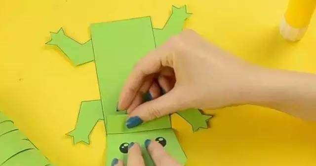 两根绿色卡纸交叉折一折,做出弹簧腿,再在卡纸球形上粘上一些突起,变色龙就做好啦~
