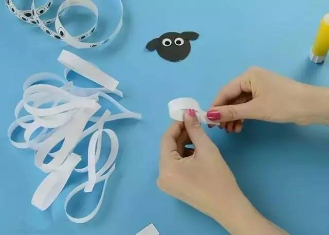 6、把黑色卡纸和纸条组合在一起,小绵羊就做好了