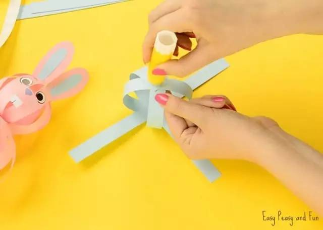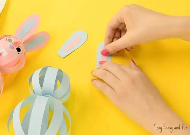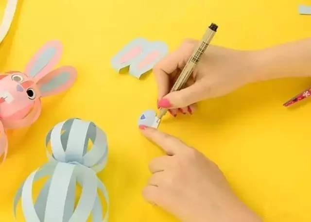 5、接下来用彩色卡纸裁剪兔子耳朵、鼻子和牙齿