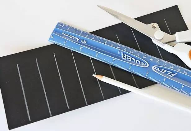 在彩纸上用铅笔画出均匀的刻度线,不要画满,留有一定的空白。