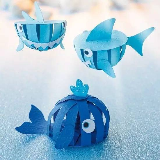 蓝色球形卡纸,粘上卡纸做的尾巴和鱼鳍,可爱的蓝鲸鱼送给小朋友们~