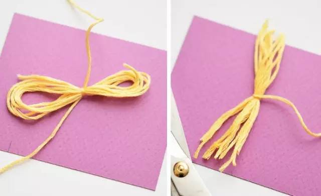 将黄绳绕成一捆,中间系住之后,再将两端剪开,灯笼的穗就做好啦~