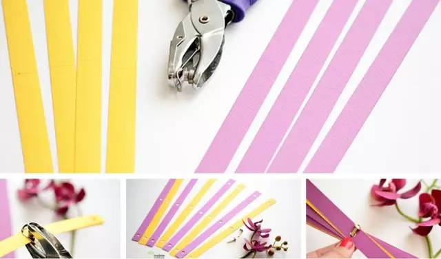 准备4条黄色长卡纸、4根红色长卡纸,用打孔器在卡纸两端和中间打3个孔。