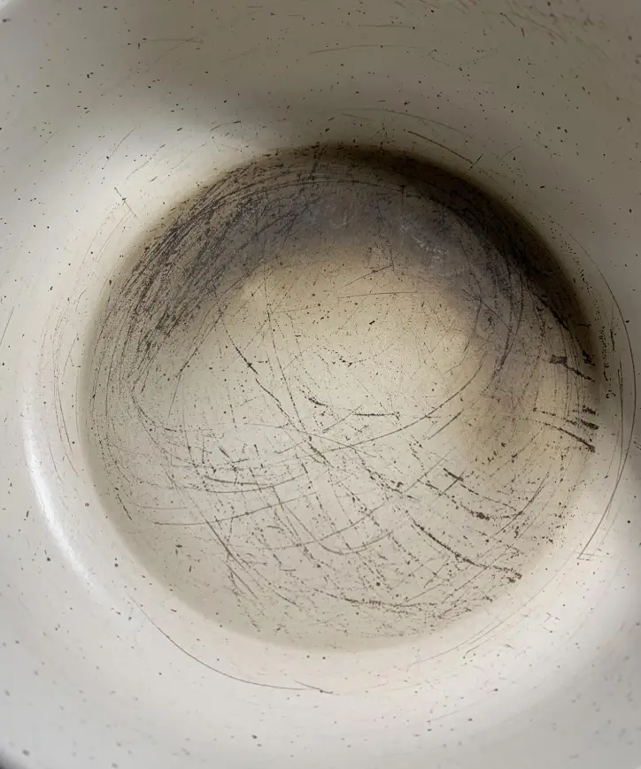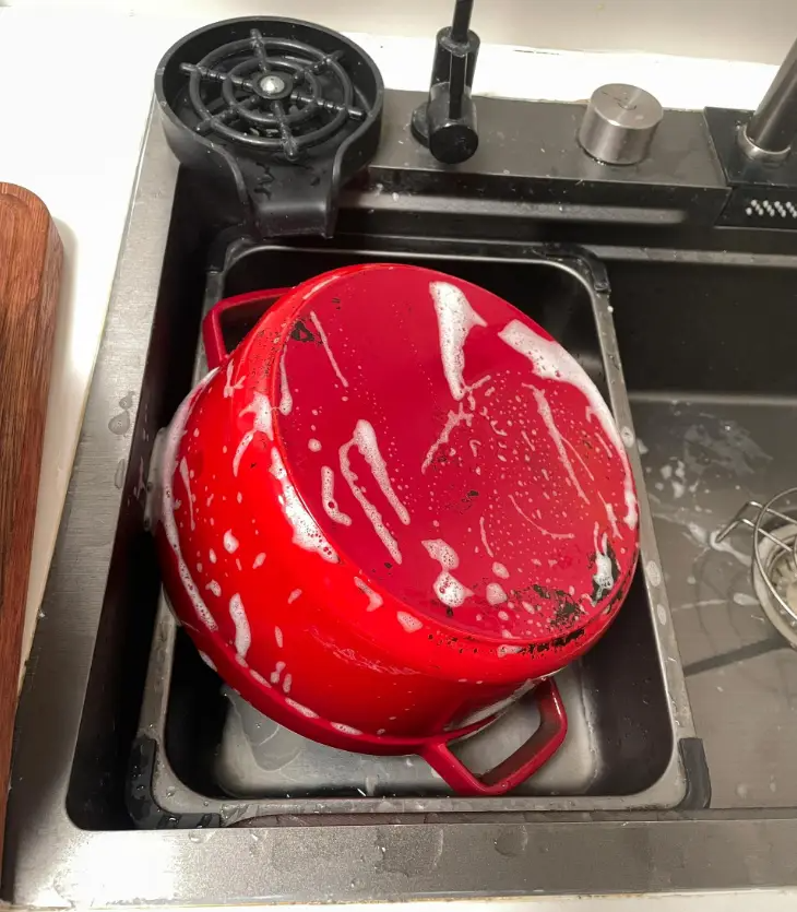 炖煮时特别容易粘锅,并且还不能用钢丝球等硬质清洁工具,不然容易刮花珐琅层。