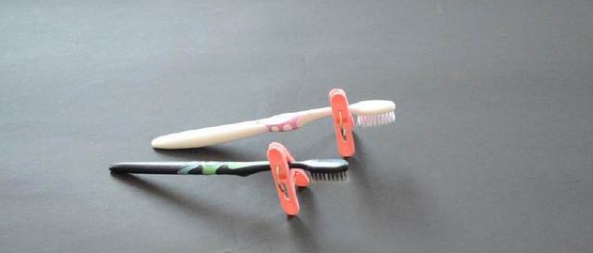 每次牙刷用完直接扔在洗漱台上很脏?教你一招,只需要用晾衣服的塑料夹子夹住牙刷的头部,再将它立起来放置就可以了。