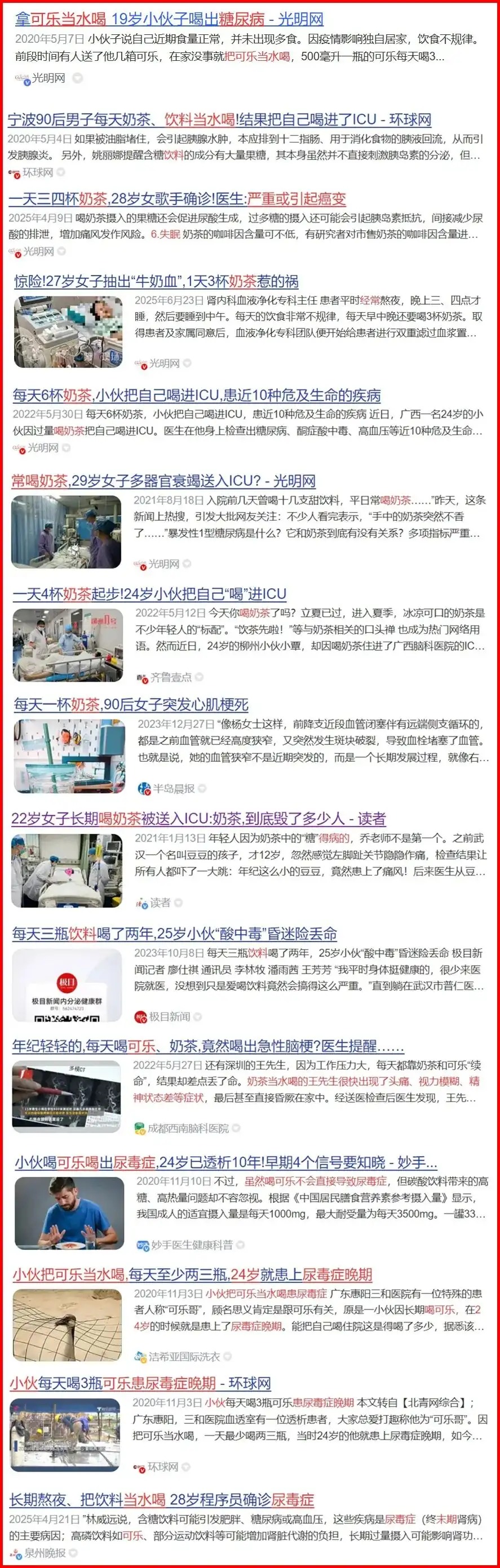 不知道从什么时候开始,越来越多的孩子和年轻人,喜欢上了色素饮料、奶茶、或其他含糖饮品。正是因为大家这个嗜好,才有无数的饮品店遍地开花,几乎每条街道有很多类似的店铺,特别是大中小学旁边。含糖饮品确实很爽,喝起来甜滋滋的。殊不知,含糖饮品喝多了,对身体的损害是致命的。今年的11月14日是第19个联合国防糖尿病日,而我国糖尿病患者已达1.4亿,这个数据还在呈上升趋势。糖尿病不可怕,可怕的是糖尿病并发症。糖尿病的发生有很多因素在影响,比如饮食、遗传、环境、作息等。虽然患上糖尿病不止是摄入糖分过多,但不可否认的事实,含糖饮料不离手,把可乐和奶茶当水喝,已经成为无数孩子和年轻人,患糖尿病或其他疾病的罪魁祸首。29岁男子喝了两年可乐,最后导致十指变形肿大;4岁女孩常吃甜食,常喝色素饮料,最后查出糖尿病;19岁男孩把奶茶当水喝,被查出骨质疏松;20岁女孩每天4杯奶茶,致脚趾溃烂,险些截肢。类似的案例,屡见于新闻报道中,相信很多人在网上都有看过。在这些已经报道的案例中,可以发现,年龄最小的是几岁的孩童,年龄最大的不过三四十岁的中年人。纵观这些案例,他们被各种疾病找上,都是因为把色素饮料、奶茶、可乐当水喝。长此以往,身体就被整垮了。小孩患病,Ta们的父母或监护人有很大的责任,而成人得病,那就是自己找的。大家想一想,现在是不是有很多孩子和年轻人,整天不喝白开水,却把色素饮料和奶茶视为珍宝。试问?这样的生活习惯,你不得病,谁会得病?给孩子喝色素饮料和奶茶,就是父母的无知;让自己喝色素饮料和奶茶,就是健康意识的淡薄。再好的身体,再年轻的生命,也禁不住含糖饮料的长期摧残。含糖饮料的危害到底有多大,很多人可能不知道。一瓶可乐≈10块方糖,约50克,而成人每日摄入的糖分是25克。你长期饮用含糖饮料,就会导致胰岛素过劳,引发糖尿病、肥胖、心血管疾病,加速皮肤老化变差。奶茶和色素饮料等含糖量高的饮品,喝多了不仅会损伤肾脏、肠胃、大脑,引发结石和痛风,还会导致血糖升高、尿酸偏高,诱发骨质疏松症和尿毒症。根据以往的研究发现:喝含糖饮料、人工甜味剂(代糖)饮料或增加糖尿病风险。与很少喝含糖甜饮料的人相比,每天喝≥2杯含糖饮料与糖尿病风险增加41%;每天喝≥2杯含人工甜味剂饮料,糖尿病风险增加11%(1杯饮料为240毫升)。更重要的是,运动也无法完全抵消含糖饮料造成的伤害。你每日吃的食物中,其实含有大量糖分。控糖都来不及,可你还专门去摄入糖分,那岂不是更过量?俗话说,物极必反。你摄入糖分过多,身体是吃不消的。那么,各种莫名其妙的疾病就会找上你,引发一系列健康问题,甚至危及生命,令你痛不欲生。我三爸在广东谷饶开车送货,他酷爱甜食和糖果。广东当地每年有很多庙会或民俗活动,而这些活动无一例外,都会摆放各种糖果。由于他和当地人混得很熟,各种活动结束后,很多人会把糖果交给三爸,而他却把这些糖果当饭吃。每次他年底回家,我看到他吃糖果的样子,就非常替他担心。为此,我没少劝过他,劝他少吃,最好不要吃。但他不听我的劝告,照吃不误。那年三爸的儿子结婚,他起床扫地,发现自己的一只脚掌和大腿突然肿得像气球一样,疼痛不止,无法走路。去医院检查后,医生说尿酸过高,不能再吃糖果或甜食。当时,三爸才知道糖吃多了的危害。自那以后,他才逐渐改掉吃糖果的坏习惯。所以,人是不能被教育的,只能自己痛醒。我劝说三爸不要吃糖,可他认为我在骗他。等他自己得病了,才知道健康的重要。因为长期喝含糖饮料,长期吃甜食,把身体弄出一身毛病的孩子和年轻人,可以说数不胜数。无数的惨痛教训,至今还是有很多人不吸取,依然胡吃乱喝。曾经有个医生说:“没有哪个国家像中国这样,在大街上,随处可见的奶茶店和药店。是什么养活了他们?是人们的无知,是人们健康意识的淡薄。奶茶里是什么?全是高糖,都是不健康的反式脂肪酸。中国如今糖尿病的患病率很高,很多人血糖异常。中国人的健康问题太严重。很多人都在抱怨看病难,看病贵,却从不重视自己的健康。就是因为很多人忽视了健康,才有那么多药店。假如每个人都重视健康,控制体重,没有那么多病人,这些奶茶店和药店能活下去吗?医生还用那么忙吗?医院还用越建越大吗?”医生的话不无道理。健康的身体首选需要保养,就像车子一样。你忽视健康,健康就会离你远去;你重视健康,健康自会环绕着你。想要拥有健康,良好的生活习惯至关重要。比如我家,从来不喝任何含糖饮料和奶茶,只喝白开水(夏季常温水,冬季温开水)每年,我都会扔掉很多去走人户时,主人家送的色素饮料和奶茶。正是因为我和妻子的言传身教,我的孩子也养成了不喝含糖饮料和奶茶的好习惯。含糖饮料和奶茶再好喝,都要少喝,最好不喝。长期用含糖饮料或奶茶代替白开水,更是万万要不得。嗜甜如命,无异于慢性自杀。世上最好,成本最低的养生方式之一,就是多喝白开水。多喝白开水不仅可以疏通肠胃,减少结石的发生,还可以美容,让皮肤更好,更可以增强免疫力,减少疾病的侵袭。世上只有喝含糖饮料得病的,从来没有喝白开水出问题的。分享读书、生活、教育、情感、婚姻等方面的感悟和思考。