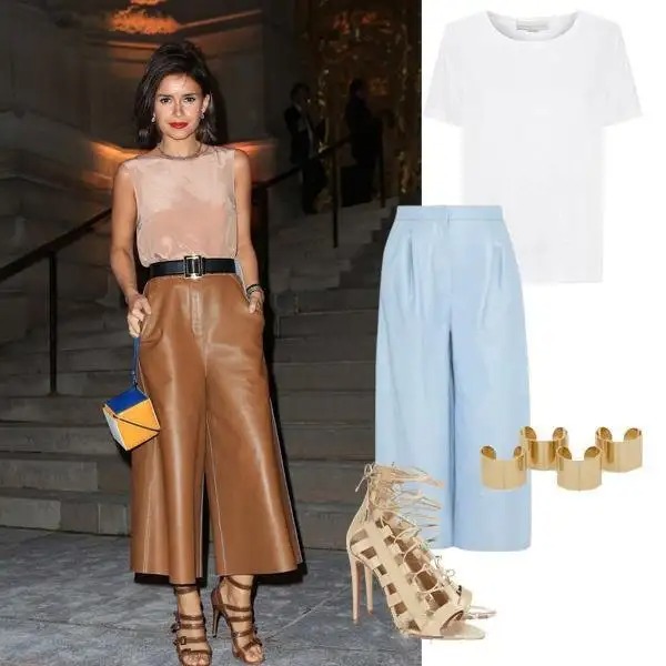 同样是比例的把握,这次Miroslava Duma则利用当下流行的阔腿裤来修饰身材。七分裤阔腿裤完美契合了2014春季的休闲风潮,无论搭配高跟鞋还是平底鞋都一样效果出众。建议将T恤束入裤腰,秀出凸显身材的高腰剪裁。