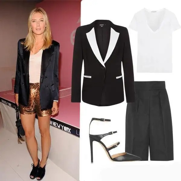 搭配:剪裁精良的西装是健壮身材女性们必不可少的显瘦单品,可配搭上闪亮动人的亮片短裤和酷劲十足的高跟鞋,这样休闲又不失性感的装扮定会让你成为焦点,璀璨生辉。对腿部线条不自信的女性,建议选择及膝的阔腿短裤来修饰身形,尽展曼妙身姿。