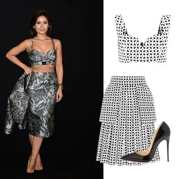 Miroslava Duma利用文胸式上衣和高腰设计的配套铅笔裙,提升腰线位置,从而拉长全身比例,让自己显得高挑细长。上衣领口正面的下凹设计还巧妙地勾勒出颈下三角区的优美曲线。挑选短款上衣和高腰半身裙进行搭配,定可让你显得分外时尚靓丽。