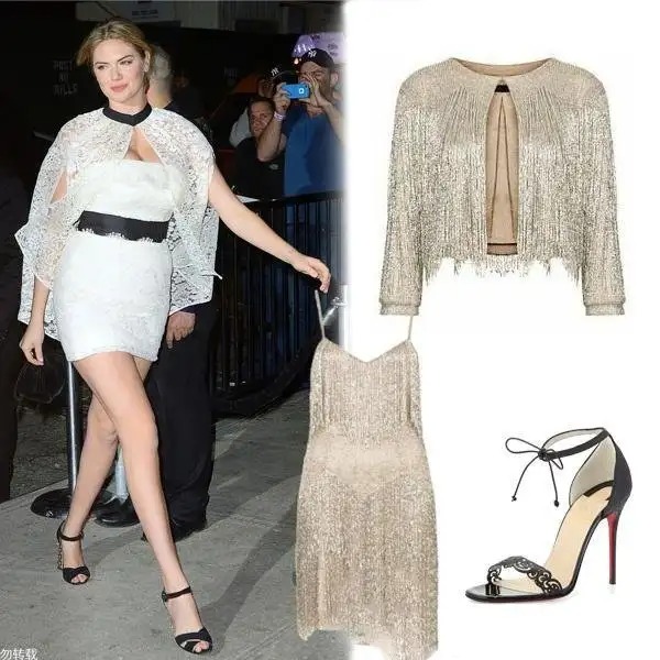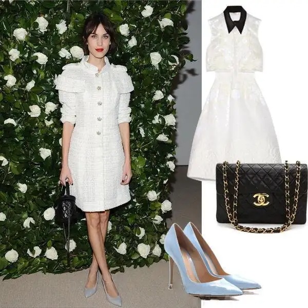 建议选择颜色明亮或上半身细节较多的单品,造成视觉上膨胀的效果。例如Alexa身穿的这条Chanel连衣裙,明亮的白色和肩部别致的细节完美掩盖了她纤弱的身躯,衬托出她独特的气质和姣好的容貌。