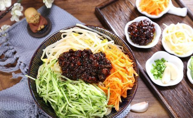 ⑦碗中放入面条,放入焯过水的豆芽、胡萝卜丝、黄瓜丝,最后来一勺炸酱,就可以啦!