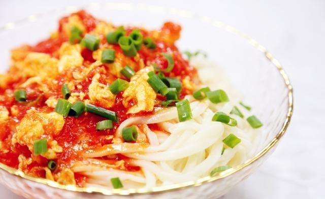 ⑤面条煮熟后捞出沥干水分,浇上不加一滴水的西红柿鸡蛋卤,再撒上葱花装饰。