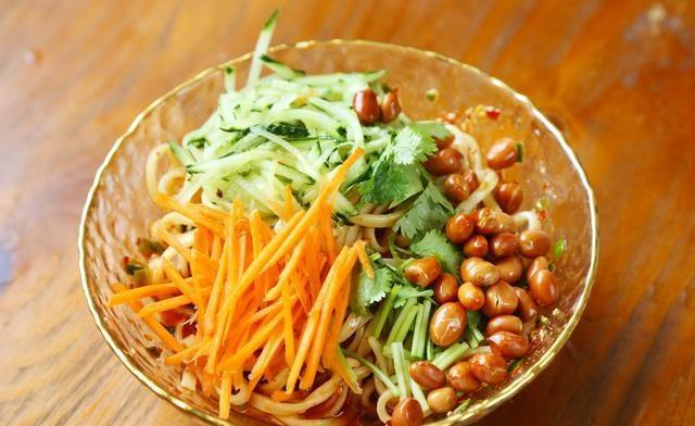 ④煮面。水烧开后下面条,煮熟捞出过凉水。凉透的面条沥干水分放入碗中,倒上调好的酱汁儿拌匀,放香菜碎、黄瓜丝儿和胡萝卜丝儿,再放一把油炸花生米。
