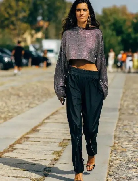 这类型的裤子其实和紧身裤的搭配思路很像,把上衣扎起来,露出腰线会比较显身材!