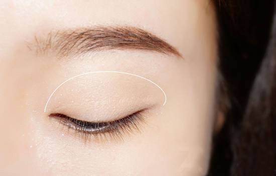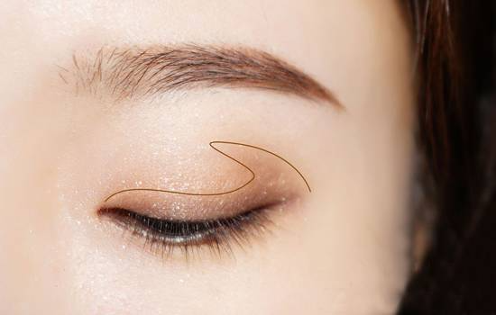 第五步:使用锥形刷沾取眼影右下角深棕色,先沿着睫毛根部从眼尾画至眼头,覆盖住眼线并将眼线晕染与眼影过渡,之后从眼尾开始一边画至眼窝凹陷处,一边画至眼头,范围大约在双眼皮褶皱处。