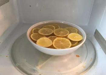 柠檬切片,放入可微波的碗中,加入4~5汤匙醋,加满水。