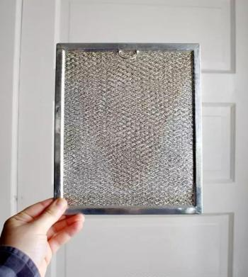 把油烟机上的滤网取下来,放入水池中。