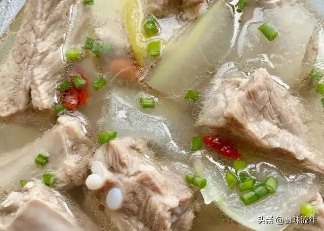 烹饪步骤:排骨焯水去血沫,冬瓜去皮切块。锅中加水烧开,加入排骨和冬瓜块。小火炖煮1小时,调味,撒上葱花即可。