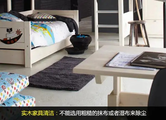 除尘工具选择:注意不能选粗糙的抹布来除尘,容易刮伤家具雕花、转角及木纹的细小劈裂部位;同时注意不能用湿布,湿布中的水分和灰尘混合后,会形成颗粒状,一经摩擦就会损害家具的表面,甚至导致家具日后出现开裂情况。