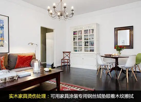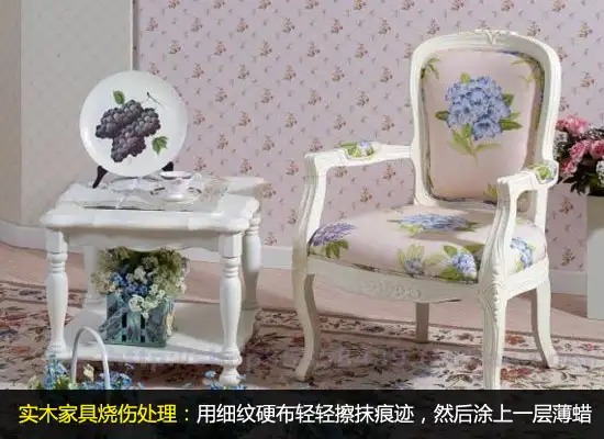 当实木家具上不小心防止了很烫的东西后,容易留下烫痕。这时可用一块干燥的、超细的家具涂装专用钢丝绒垫于烫痕处,直接顺着木纹的方向擦拭;也可以用色拉油或蛋黄酱涂在烫痕处,取软布顺木纹轻轻擦拭,然后再换一块清洁的软布将其擦干净,最后上光。