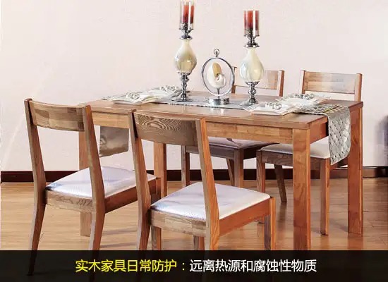 不要在实木家具上放置过热或过冷的东西,远离明火,同时也不要使家具表面接触到腐蚀性的物质,如酒精、香蕉水、汽油、指甲油、强酸、碱等。这些都会对实木家具造成很难修复的损伤。