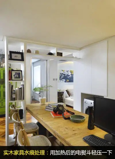家具被滴水后未及时擦掉,干后会遗留水迹,可用一块稍厚湿布盖在水迹上,用加热后的电熨斗轻压一下,水的痕迹即可以消除。