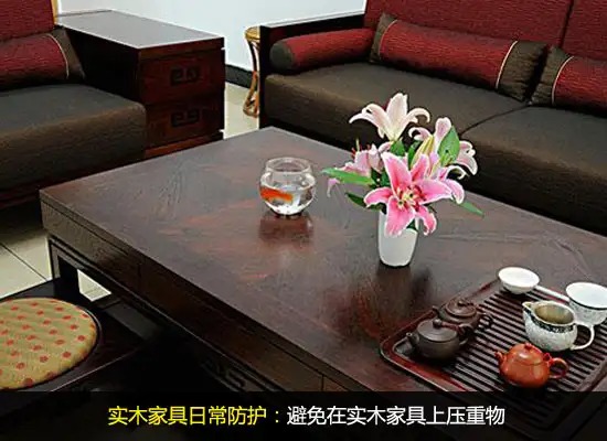 家具表面避免长期放置过于沉重的物品,特别是电视、鱼缸等,容易造成家具变形。实木家具上放置东西的时,应在表面先铺垫一层布垫,能够有效防止凹痕产生。