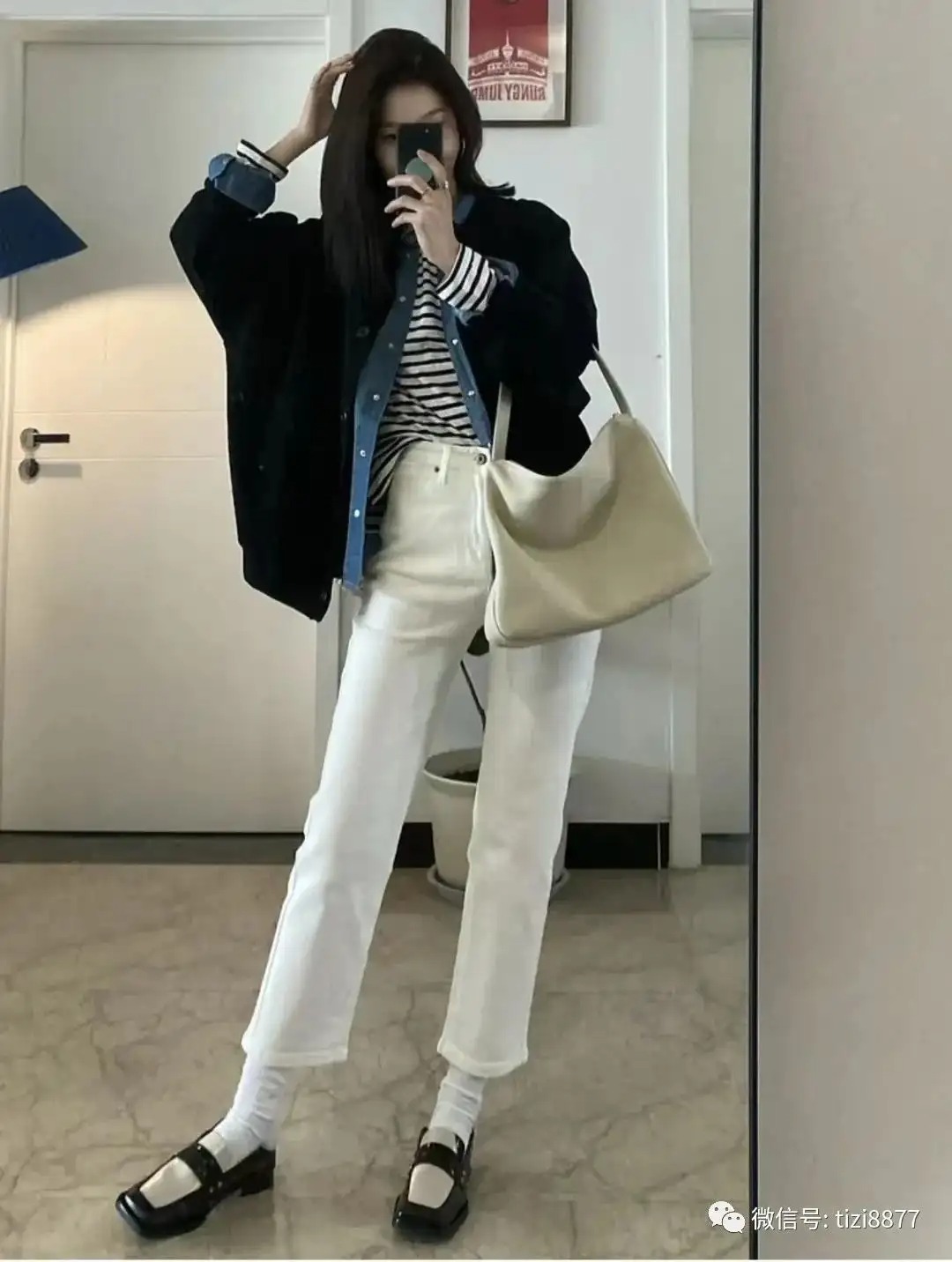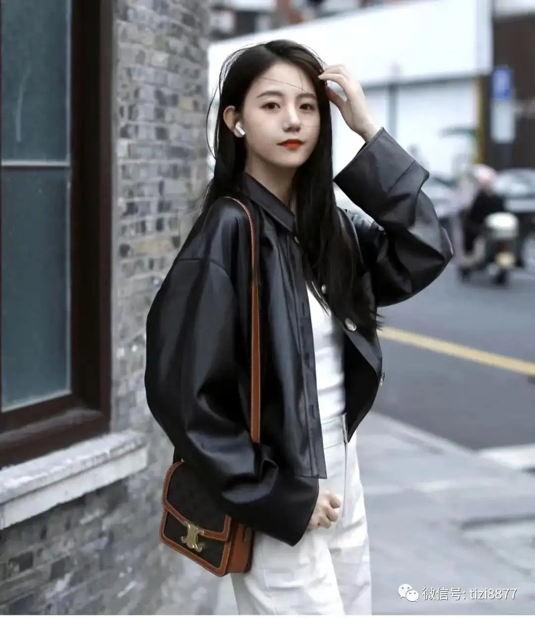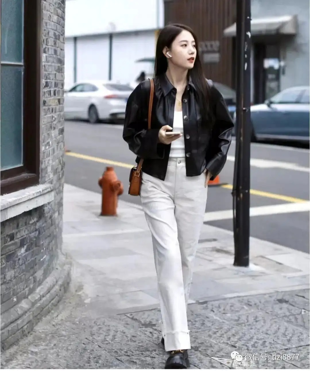 look12 黑色短皮衣夹克+白色牛仔裤