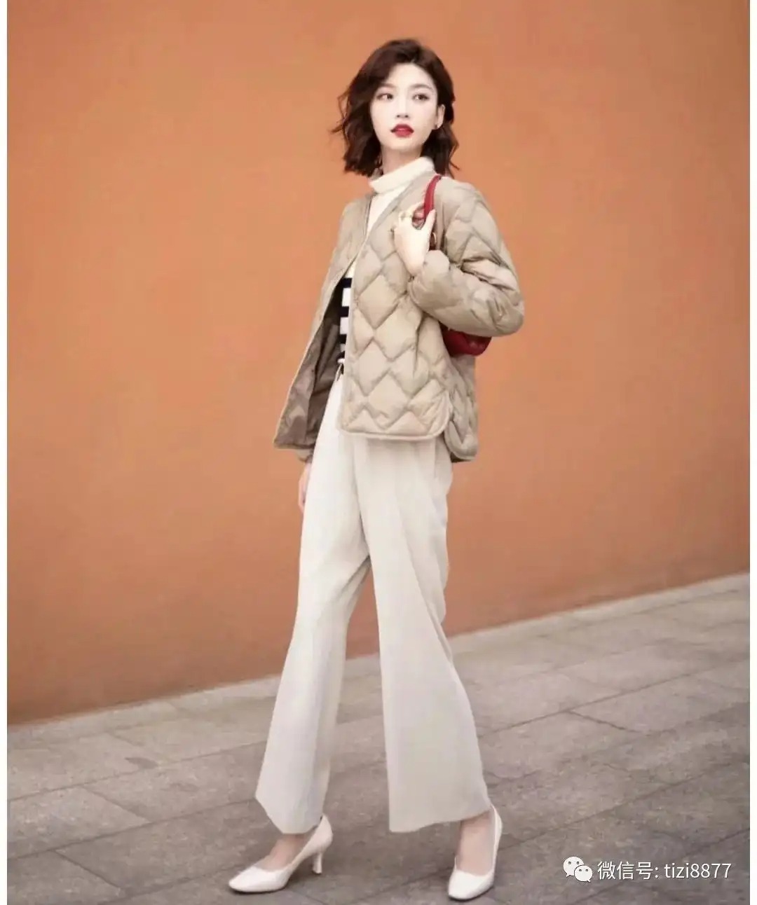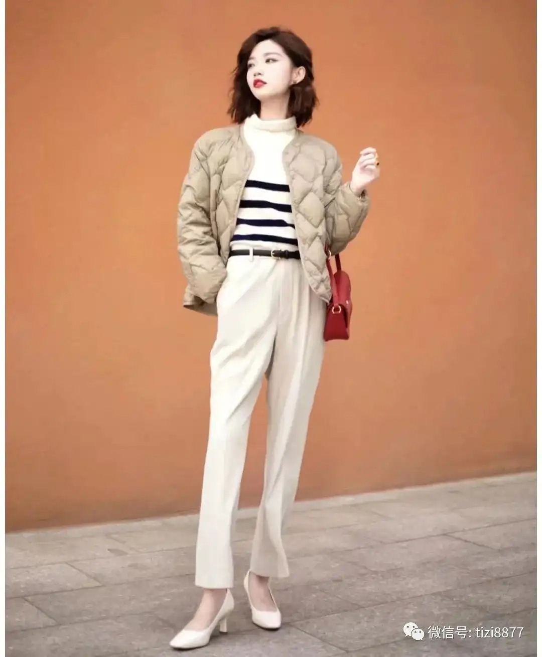 波纹轻羽绒菱格的设计拒绝冬季臃肿,冬季也能穿出休闲感,质地轻柔和时尚感双重拥有,内搭条纹针织毛衣,保暖又显气质,下半身搭配同色系西裤,上班通勤下班聚会皆可~