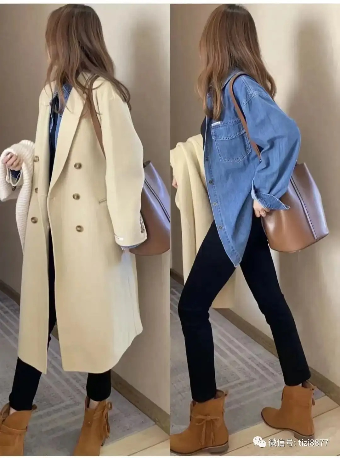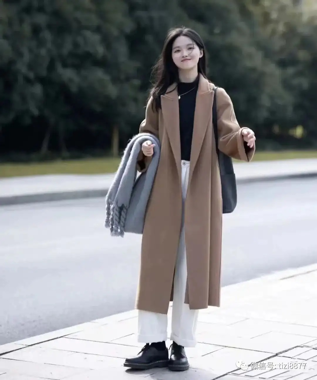 look1 驼色大衣+黑色打底/白色牛仔裤