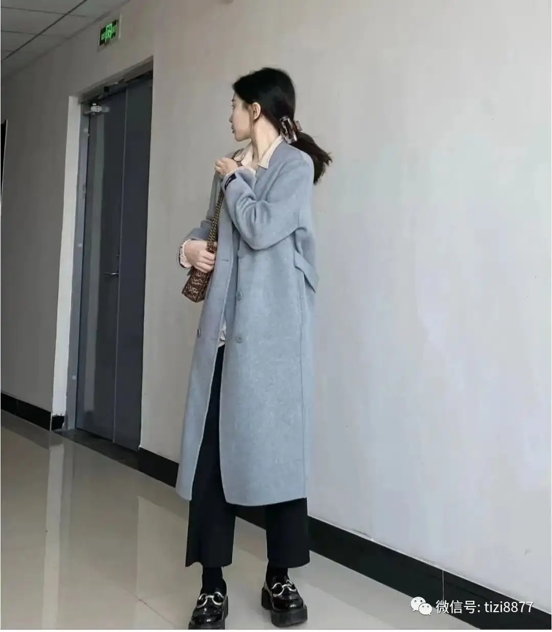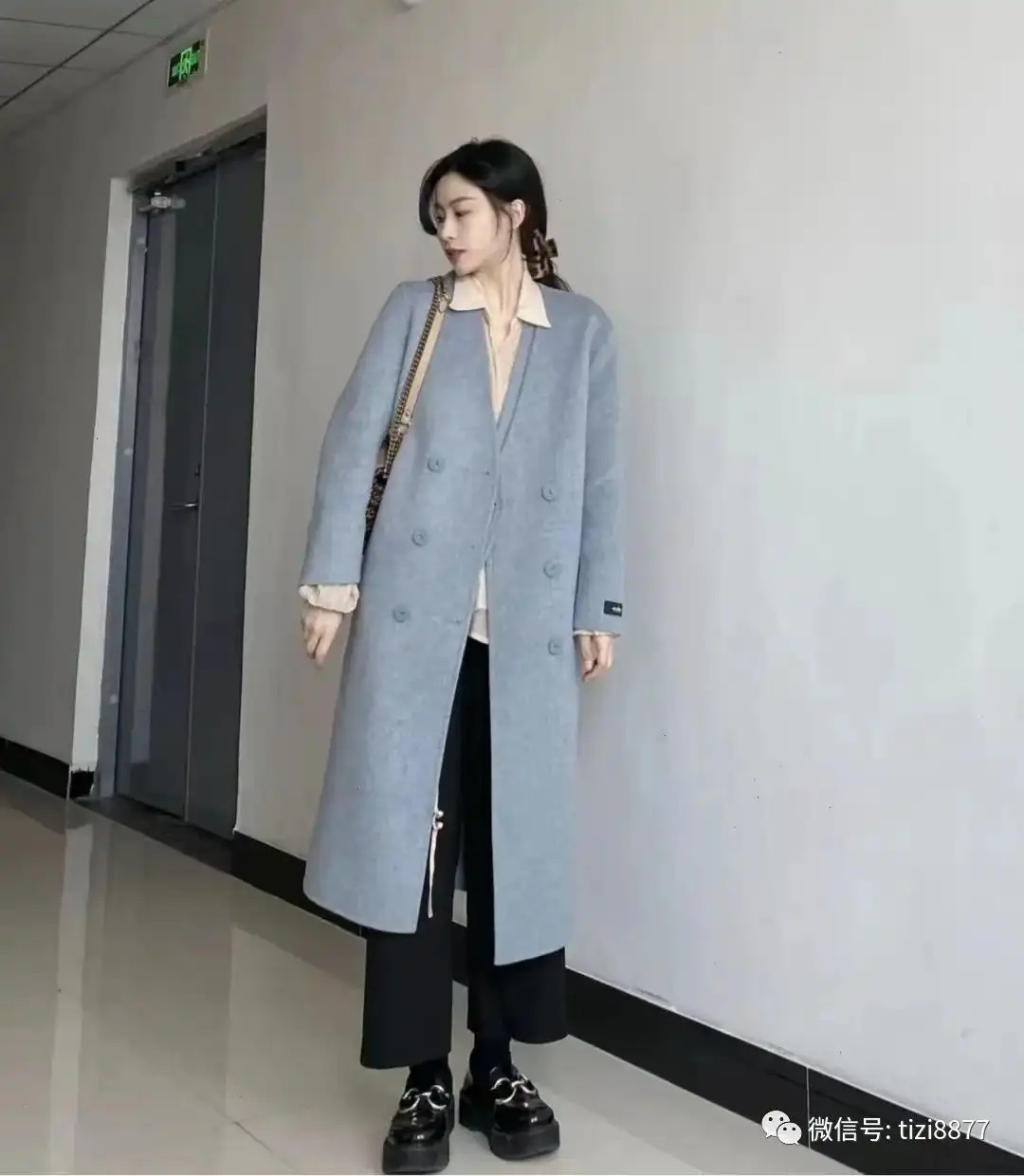 look16 雾霾蓝大衣+粉色衬衫/黑色九分阔腿裤
