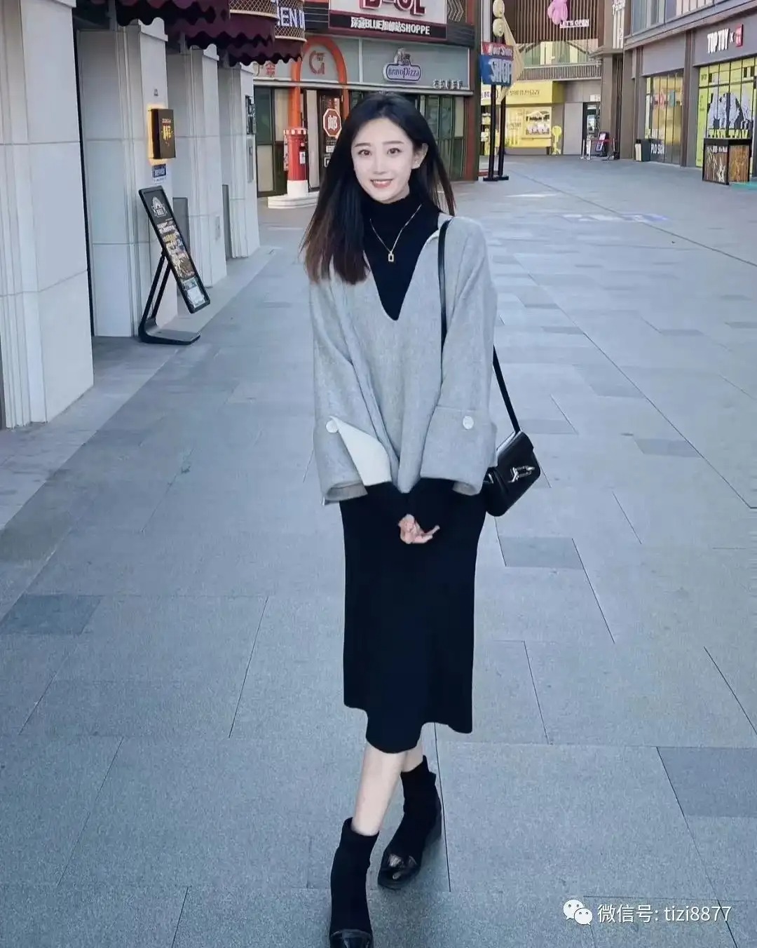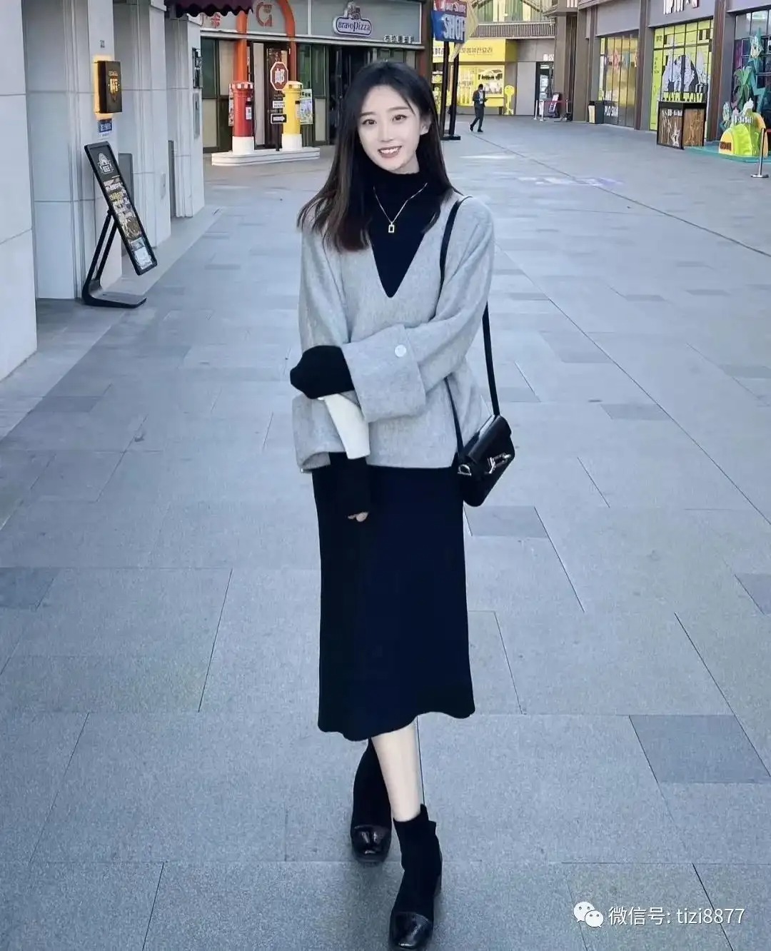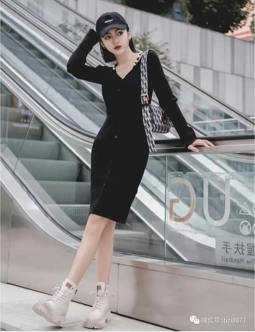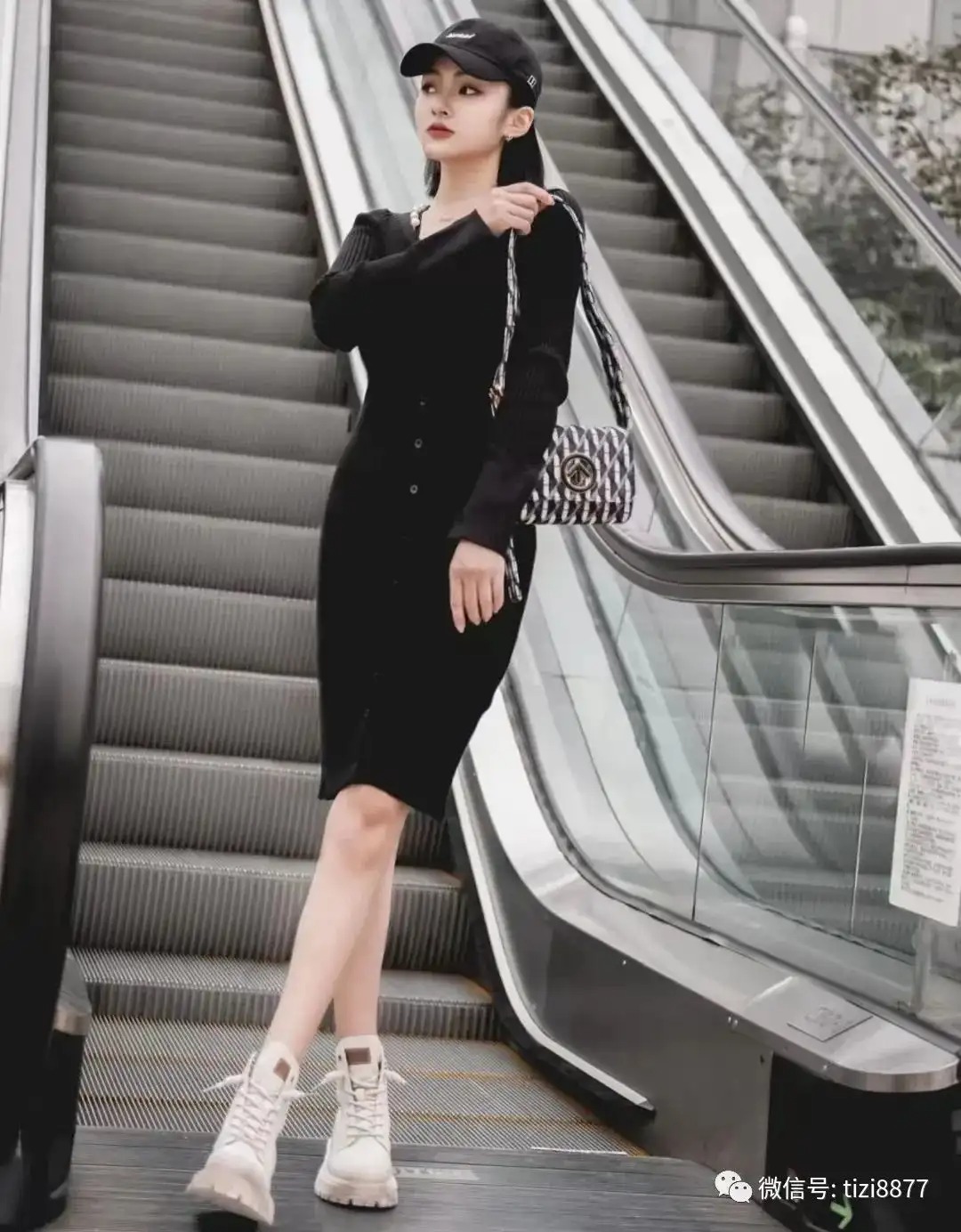 look11 黑色针织连衣裙+白色马丁靴