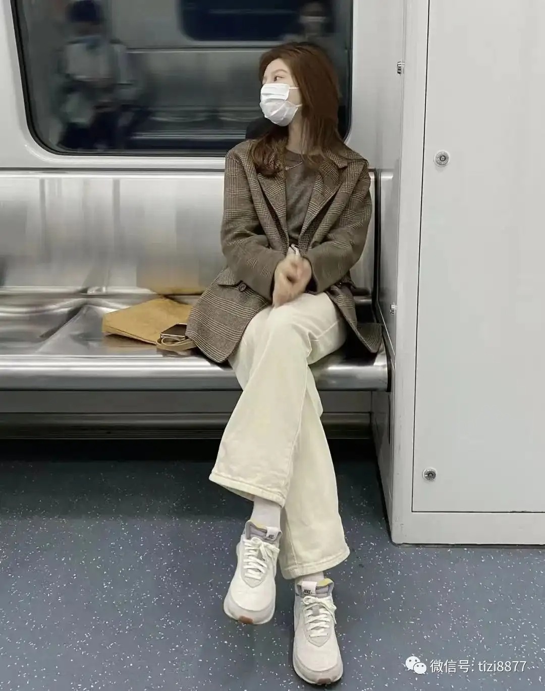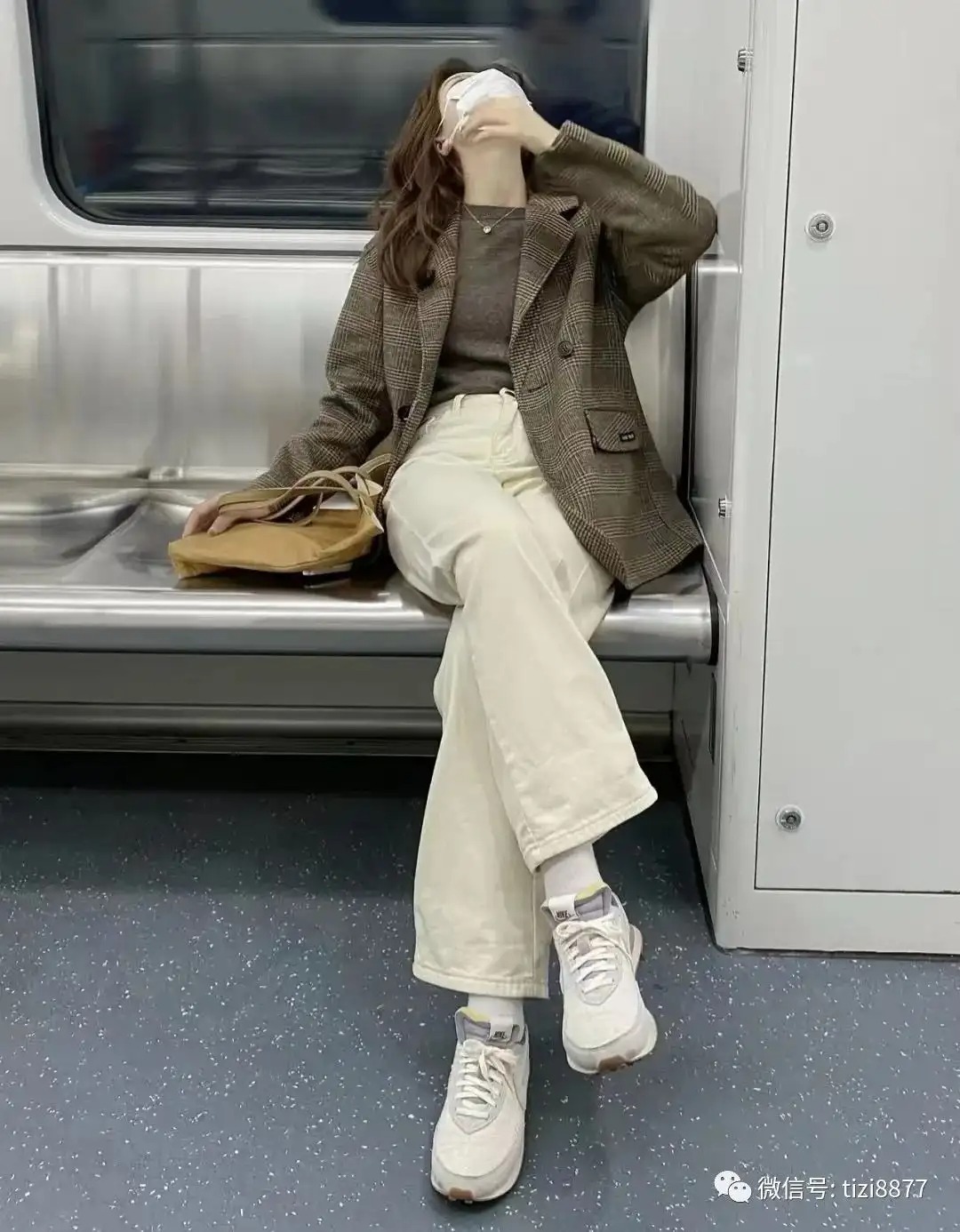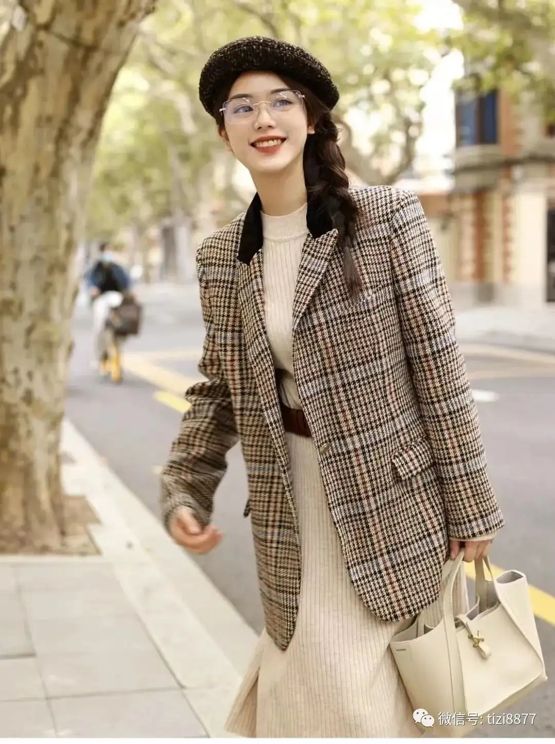 look6 棕色格纹西装+米色针织长裙