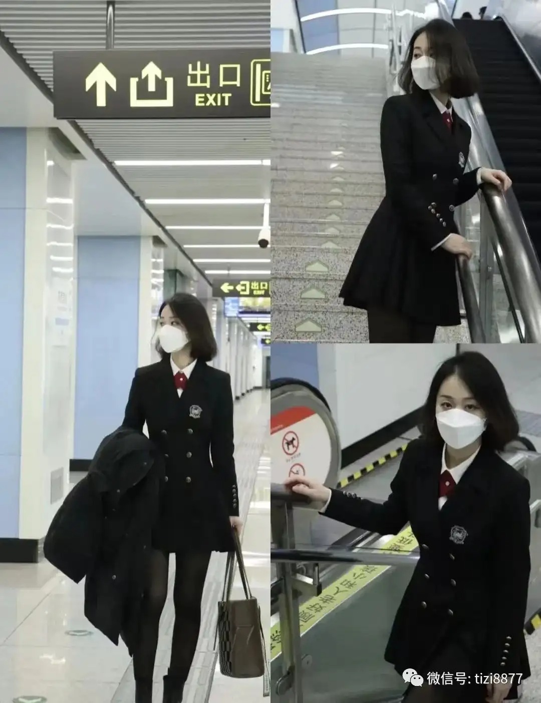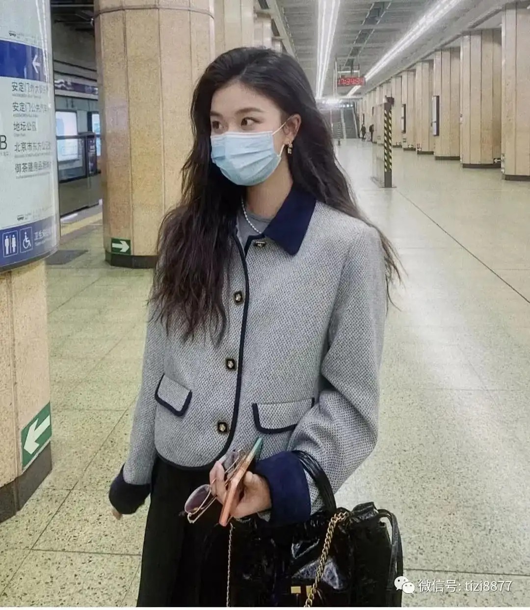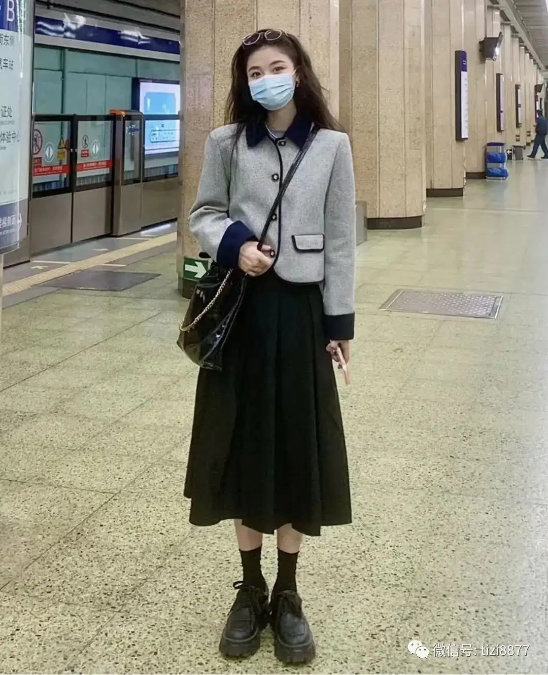 难得穿裙子,这一整套真的显气质,被朋友猛夸一下,灰色小香风短外套搭配黑色打褶裙,复古感和地铁站里的氛围有点搭,头发卷完好像有点过于蓬松了~~