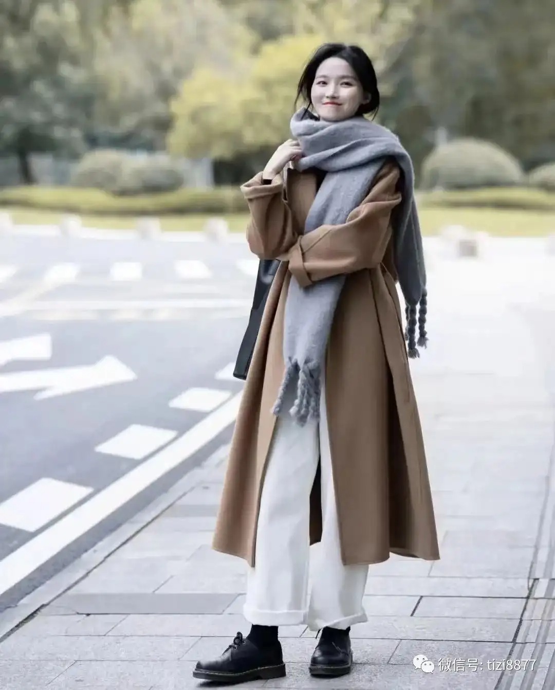 系扣小围脖也起到了画龙点睛的作用,增加了一点韩系风格,包包和鞋子用了同色系,整体颜色不会太多看上去会更舒服~