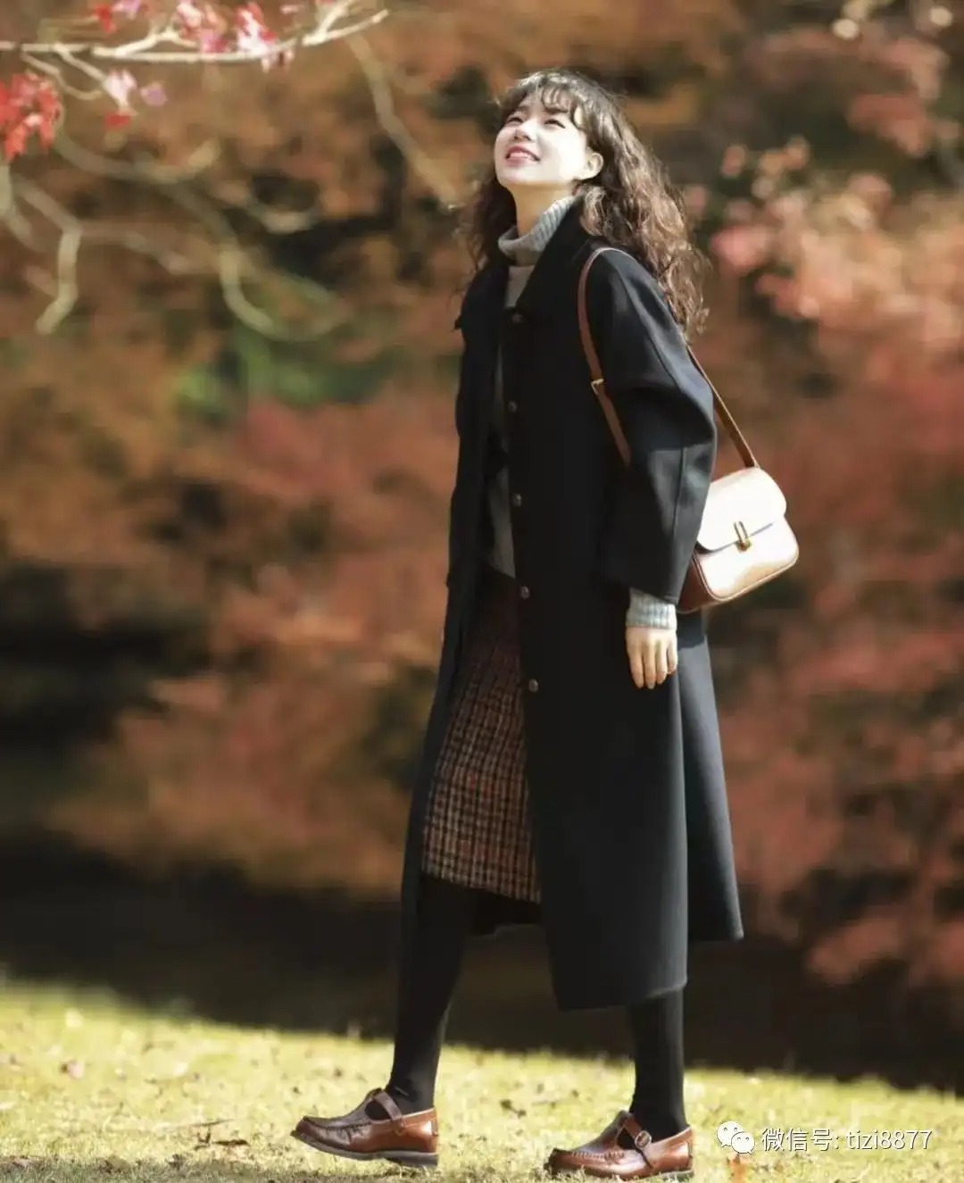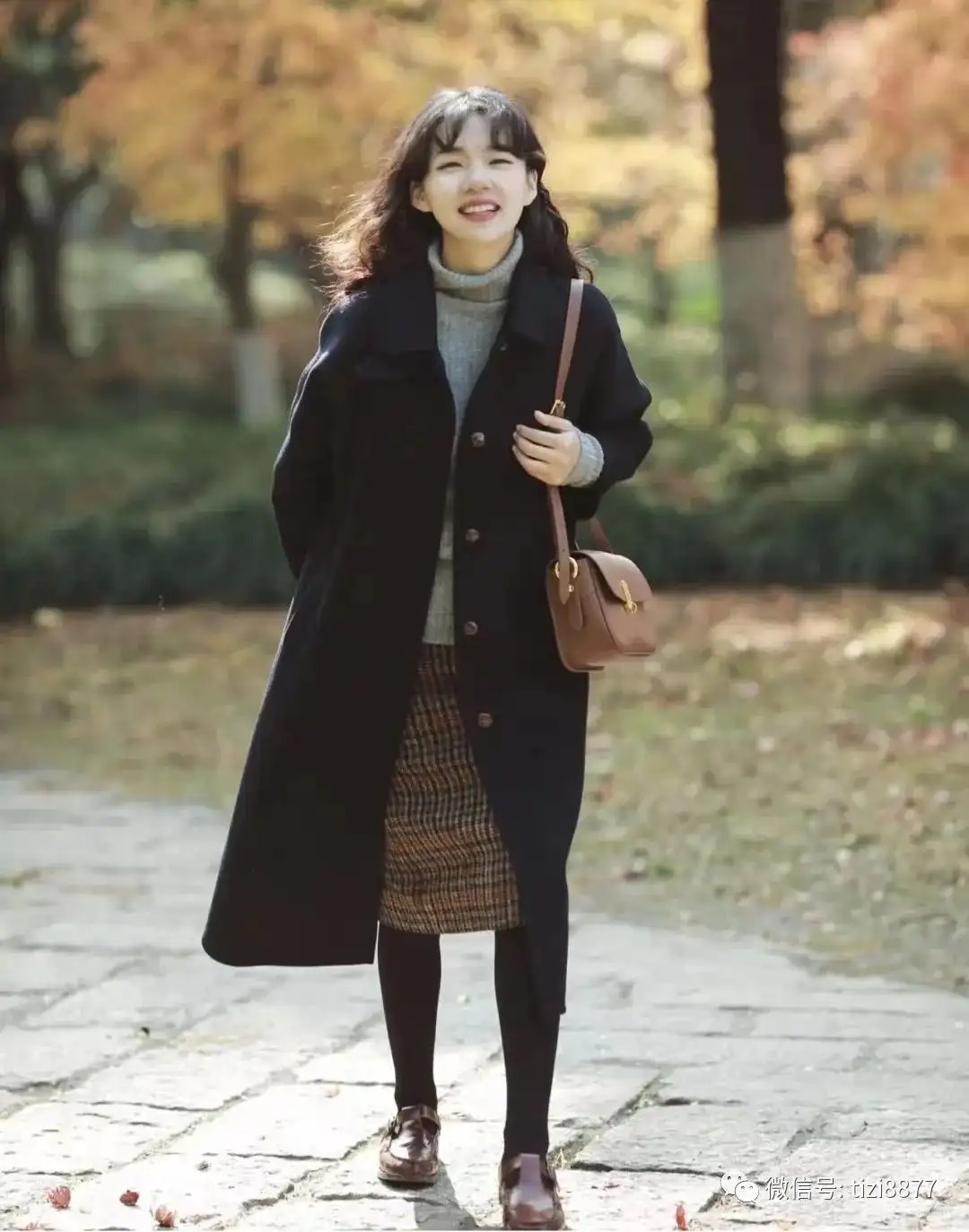 look8 藏蓝色大衣+灰色高领毛衣/格纹裙