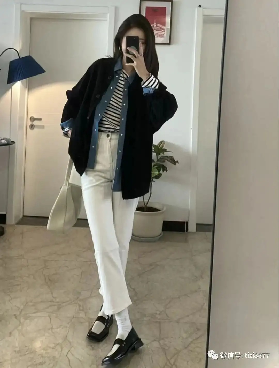 look10 黑色卫衣外套+叠穿蓝衬衫/条纹/白裤子