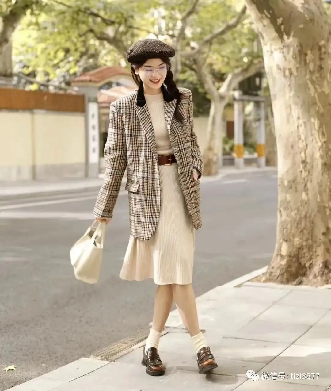 好爱这个可以随意穿衣的季节,棕色格纹西装和米色针织长裙搭配,舒适随性又文艺复古,贝雷帽加上一副无框眼镜,仿佛回到艺考时的模样,喜欢这样文艺慵懒的秋天~
