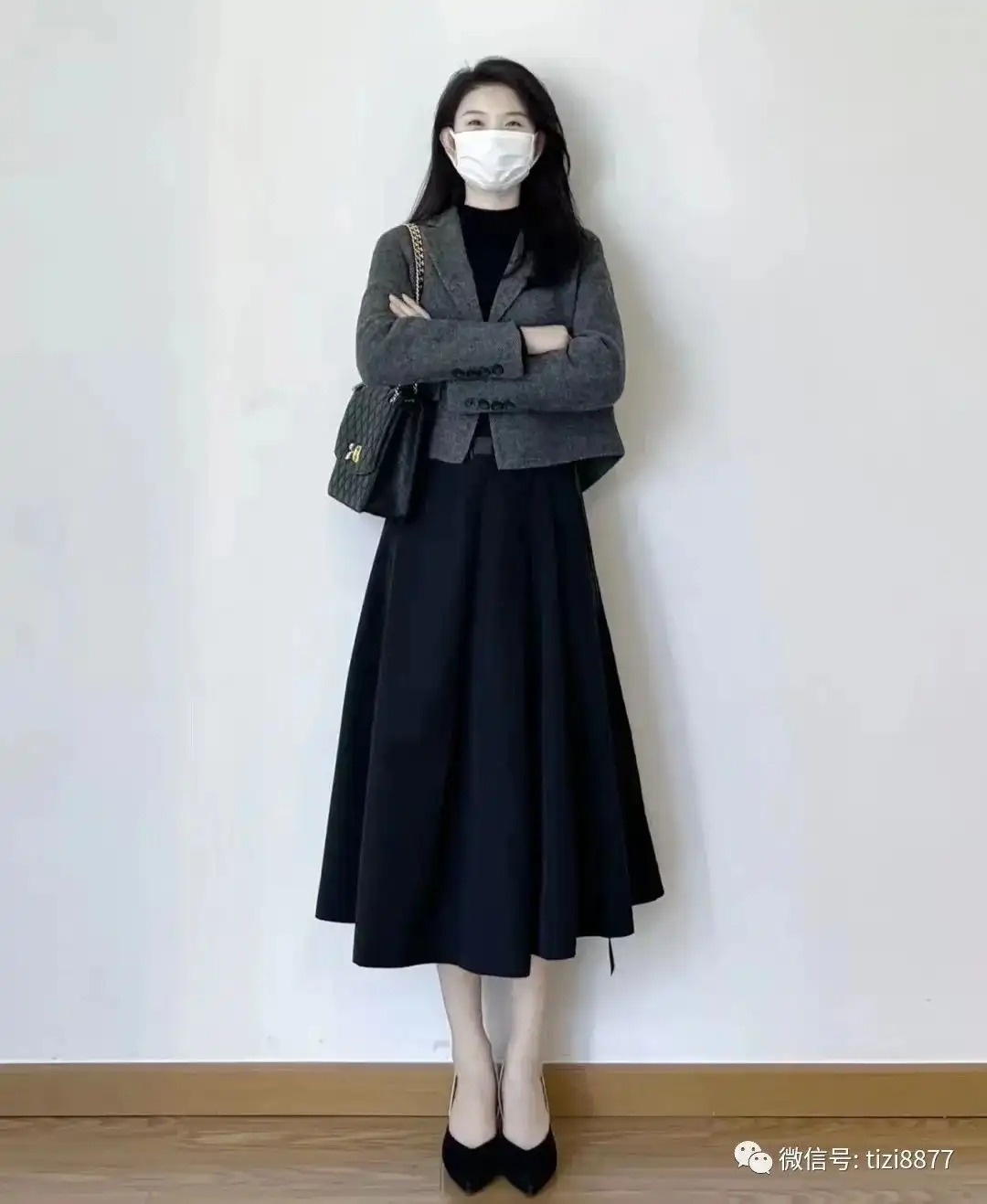 look13 灰色短外套+黑色内搭/黑色高腰伞裙