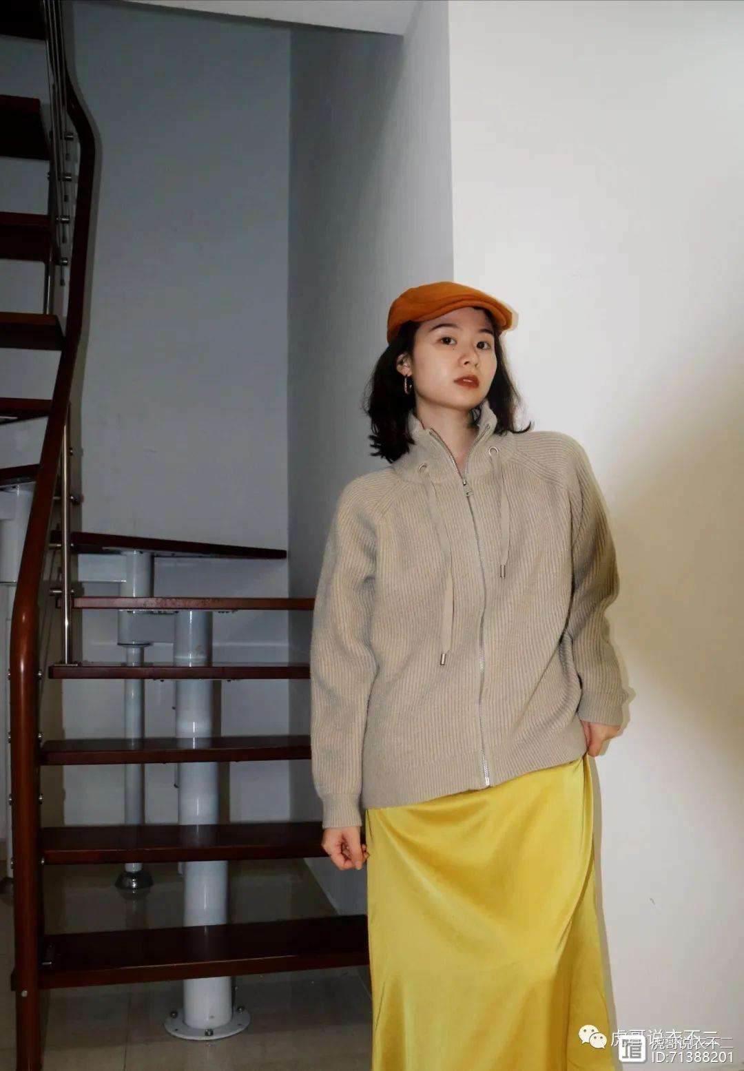 一件杏色的针织拉链罩衫搭配上明黄色的绸缎半身裙,质感的面料和流畅的剪裁使造型处处体现着高级的质感,色彩的强烈对比度增添了一抹明媚的气息,显得更为优雅。