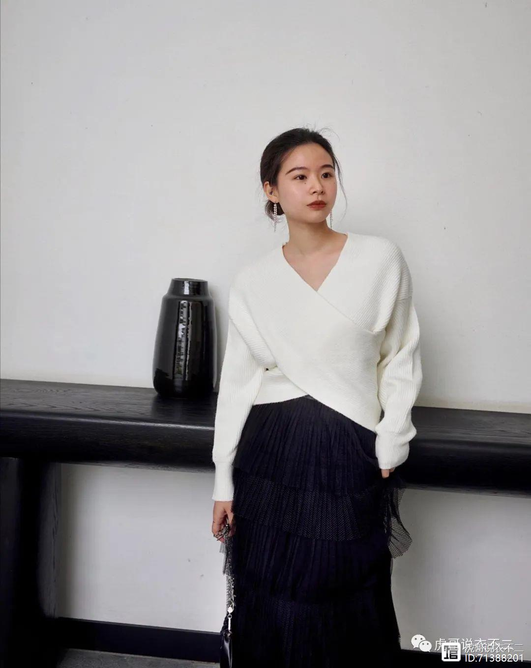 一件白色的毛衣搭配上黑色的半身裙,交叉的领口设计显得更为时髦潮流,营造出v字的领口,更显性感。