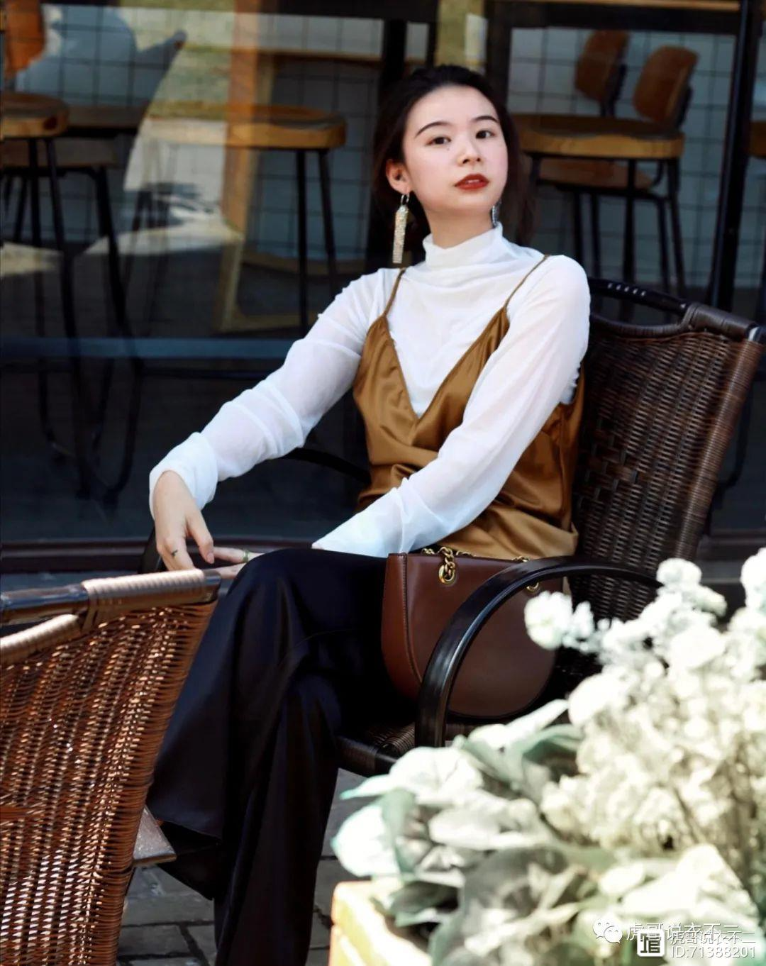一件白色的针织打底衫搭配棕色丝绒吊带和黑色的阔腿长裤,简约的配色和流畅的版型使整体造型处处体现着温柔优雅的气质,充满了高级感。