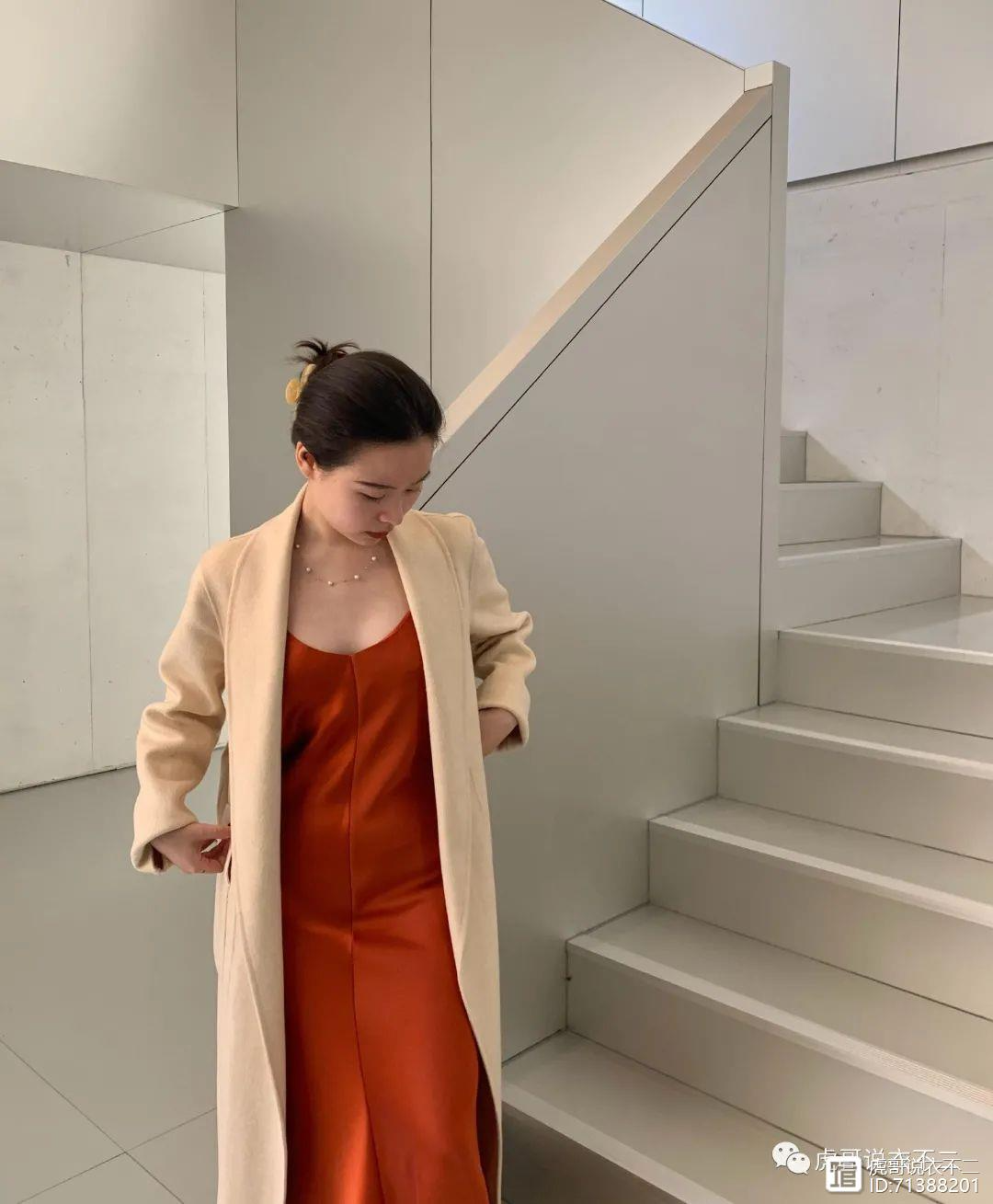 一件南瓜色吊带真丝连衣裙自带优雅华贵气质,搭配杏色毛呢大衣增添气场,直筒的版型对身材的包容度更高,对微胖女性十分友好。