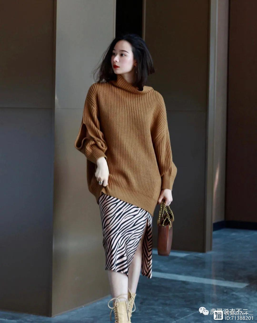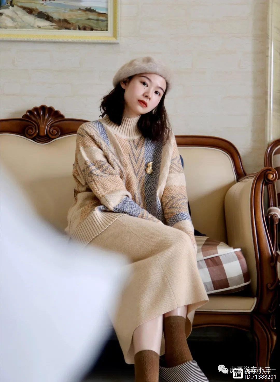 秋冬季节的半身裙更多的搭配毛衣为主,毛衣柔软的面料可以体现出软糯的感觉,因此搭配毛呢半身裙更为合适。