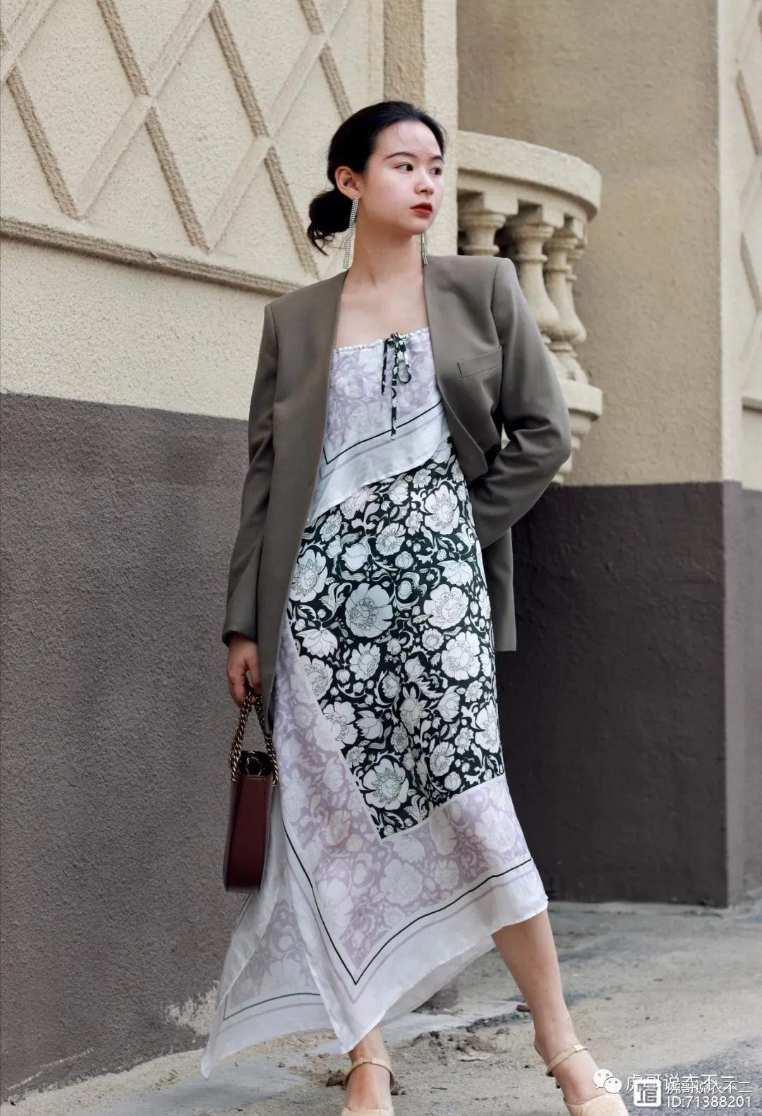 一件墨绿色吊带连衣裙搭配灰色的西装,整体属于偏冷的色调,但是并不会让人觉得沉闷,连衣裙不规则的下摆设计平添几分俏皮与灵动,显得更为飘逸优雅。