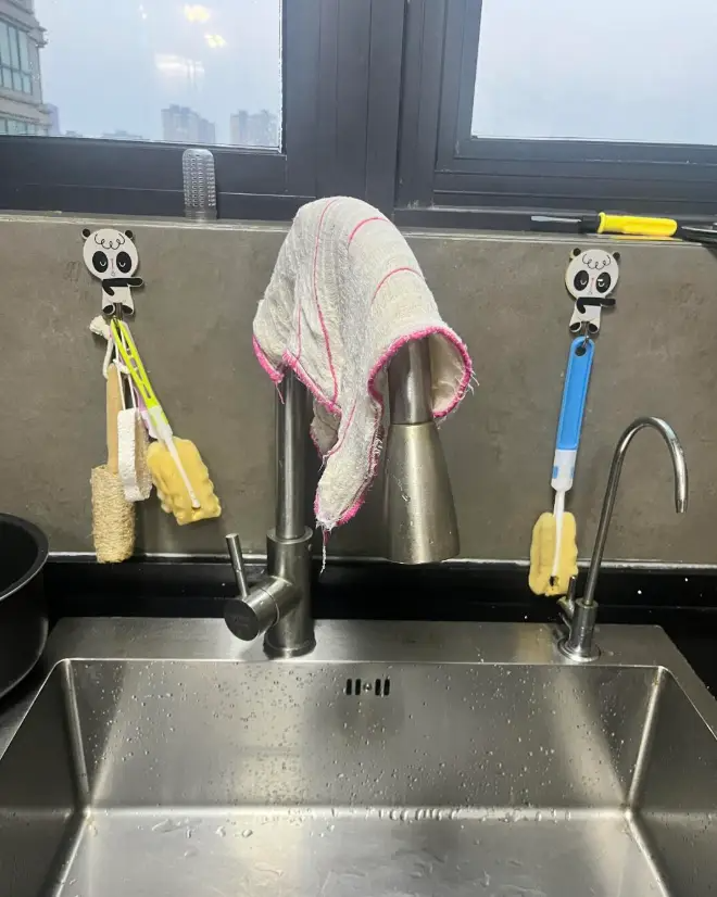 可以用一根水管+两个挂钩,然后将其固定在墙上,就可以用来收纳抹布了。